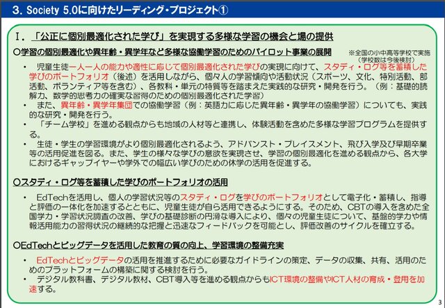 そして、「公正に個別最適化された学び」について、「児童生徒一人一人の能力や適性に応じて個別最適化された学びの実現に向けて、スタディ・ログ等を蓄積した学びのポートフォリオ(後述)を活用しながら、個々人の学習傾向や活動状況(スポーツ、文化、特別活動、部活動、ボランティア等を含む)、各教科・単元の特質等を踏まえた実践的な研究・開発を行う(例:基礎的読解力、数学的思考力の確実な習得のための個別最適化された学習)。」「ICT 環境の整備、ビッグデータ活用に係る個人情報保護の在り方についての整理等の条件整備や、強みと限界を踏まえた効果的な導入方法など、EdTech の一層の活用に向けた課題の整理及び対応策について官民を挙げた総合的な検討を行った上で、一定の方針を示す。また、データの収集、共有、活用のためのプラットフォームの構築に関する検討を行う。」などの説明がなされています。