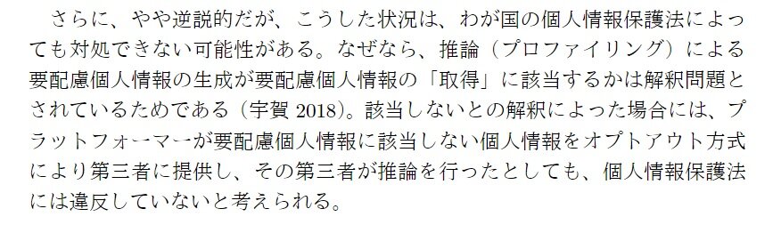 『さらに、やや逆説的だが、こうした状況は、わが国の個人情報保護法によっても対処できない可能性がある。なぜなら、推論(プロファイリング)による要配慮個人情報の生成が要配慮個人情報の「取得」に該当するかは解釈問題とされているためである(宇賀2018)。該当しないとの解釈によった場合には、プラットフォーマーが要配慮個人情報に該当しない個人情報をオプトアウト方式により第三者に提供し、その第三者が推論を行ったとしても、個人情報保護法には違反していないと考えられる。』