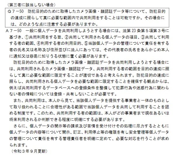 (前略)『防犯目的のために取得したカメラ画像・顔認証データを共同利用しようとする場合には、共同利用されるカメラ画像・顔認証データ、共同利用する者の範囲を目的の達成に照らして真に必要な範囲に限定することが適切であると考えられます。』