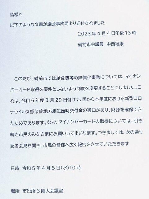 【速報】備前市は給食費の無償化事業を今年度も行い、マイナンバーカード取得を要件とする施策を撤回しました!!よかった‼️明日記者会見らしいです。市民の声が届きました。https://twitter.com/Munekag/status/1643133352881561600?t=x-IxeZcgycD2FEcAv660Hw&s=09