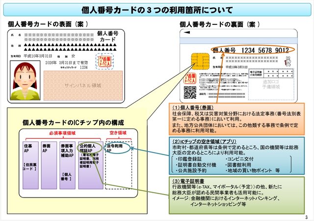 マイナンバーカードはマイナンバーが記載されているだけでなく、ICチップ部分に公的個人認証サービスの電子証明書(署名用電子証明書と利用者署名用電子証明書)があり、この電子証明書によりe-TAXやマイナポータルや民間企業によるネットショッピング等による利用ができるようになっています。またICチップの空き領域は、行政機関や自治体が図書館利用カードや公共施設予約などに利用できることとなっています。