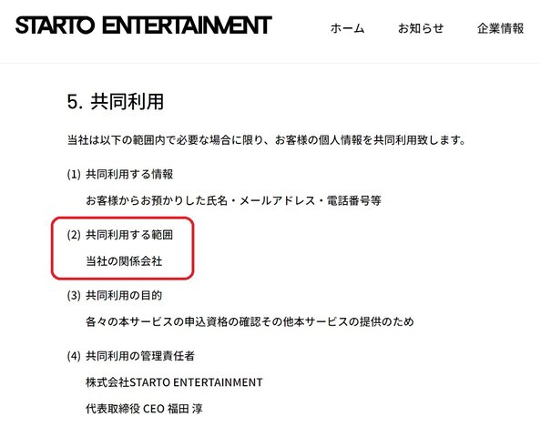 そのため、共同利用の範囲について「関係会社」等と記載すること自体は許されるのですが、自社ウェブサイトのどこかにその「関係会社」はどの会社であるのか表示しておかないといけません。(そうでないと本人が自分の個人データがどこと共同利用されるか分からない。) ところが、STARTO社サイトのどこをみても「関係会社」に関する記述は存在しないようです。
