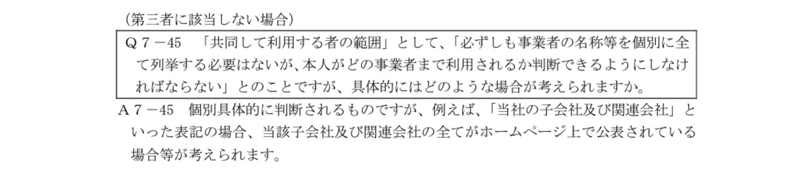 この点、国の個人情報保護委員会(PPC)の個人情報保護法ガイドラインQAの7-45は、ざっくりというと、「共同利用の範囲を「関連会社」等と表記することも許されるが、しかしそのように表記した場合には、Webサイト等のどこかに当該関連会社の一覧表などを表示しないといけない」と解説しています。