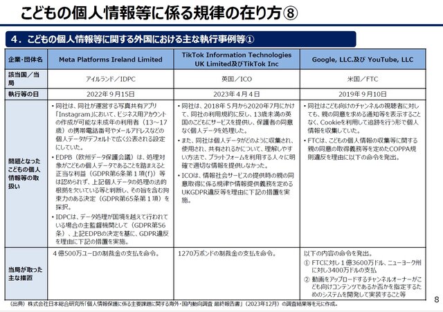 さらに本資料8頁以下は、子どもの個人情報に関する外国における主な執行事例として、InstagramやTikTok、YouTubeなどの事例をあげています。