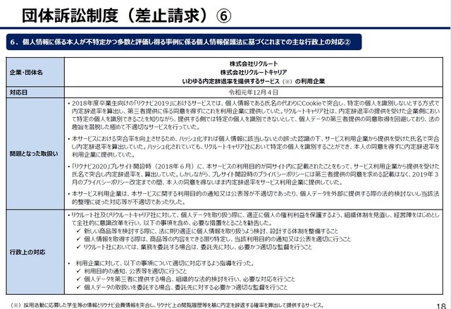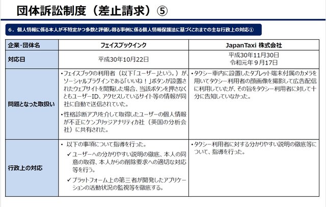 本資料15頁は、適格消費者団体は、「不当な勧誘」、「不当な契約条項」、「不当な表示」などの事業者の不当な行為をやめるよう求めることができるとし、「事業者が不特定かつ多数の消費者に対して消費者契約法等に違反する不当な行為を行っている、又は、行うおそれのあるとき」には差止請求を行うことができると説明しています。この「消費者契約法等」には消費者契約法のほか、景品表示法、特定商取引法、食品表示法が規定されていると説明されています。(個人情報保護法はまだ規定されていない。)また本資料17頁は、団体訴訟の差止請求に関連し、「個人情報に係る本人が不特定かつ多数と評価しえる事例に係る個人情報保護法に基づくこれまでの主な行政上の対応」として、Facebook事件(平成30年10月)、JapanTaxi事件(平成30年11月、令和元年9月)、リクルート内定辞退率予測データ事件(2019年)、破産者マップ事件(令和4年)、ビジネスプランニング事件(令和6年1月)の概要をあげています。