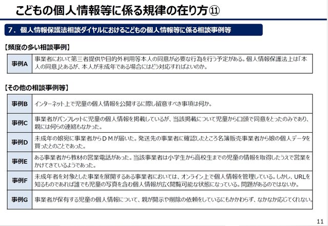 なお本資料12頁は、「個人情報保護法相談ダイヤルにおける子どもの個人情報等に係る相談事例等」として、頻度の多い相談事例や、その他の相談事例等をあげていますが、とくに「事例C 事業者がパンフレットに児童の個人情報を掲載しているが、当該掲載について児童から口頭で同意をとったのみであり、親には何らの連絡もなかった」事例や、「事例D 未成年の娘あてに事業者からDMが届いた。発送先の事業者に確認したところ、名簿販売業者から娘の情報を取得したうえで営業をかけているようであった」という事例、「事例G 事業者が保有する児童の個人情報について、親が開示・削除等の請求をしているにもかかわらず、なかなか応じてくれない」事例、などを読むと、やはり子どもの個人情報の法規制は待ったなしだと思われます。