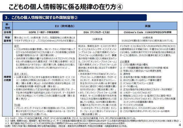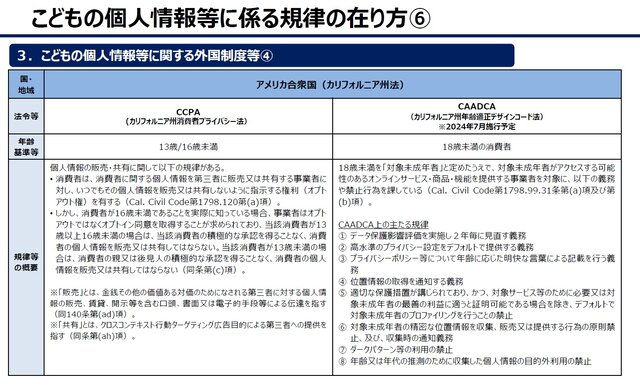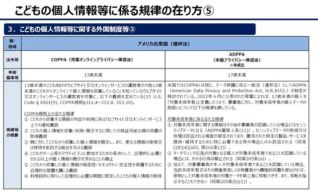 また、本資料3頁以下は、子どもの個人情報に関する外国制度として、EU、イギリス、アメリカ、中国、韓国、インド、インドネシア、ブラジル、カナダ等の法制度を概観しており、「子どもの個人情報等をセンシティブ情報又はセンシティブデータと分類した上で特別な規律の対象とするケース」や「子どもの個人情報に特有の規律を設けるケース」が多いと分析しています。
