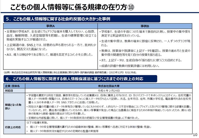 加えて本資料10頁は、日本における子どもの個人情報に関する社会的反響の大きかった事例として、①全寮制の学校Aが、全生徒にウェアラブル端末を購入してもらい、心拍数、 血圧、睡眠時間等の個人データを収集しようとした事件(広島叡智学園事件(2018年))、②学校Bで、生徒の手首につけた端末で脈拍を計測し、授業中の集中度を測定する実証研究を行った事件(市立鷲宮中学校事件(2021年))の概要が紹介されています。