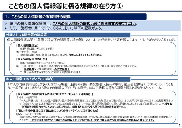 本資料1頁は、まず「現行の個人情報保護法上、子どもの個人情報の取扱い等に係る明文の規定はない」とした上で、個人情報保護法ガイドライン(通則編)2-16および個人情報保護法ガイドラインQA1-62が、「「本人の同意」を得ることが求められる場面(目的外利用、要配慮個人情報の取得、第三者提供等)について、以下のとおり、「一般的には12歳から15歳までの年齢以下の子どもの場合には法定代理人等から同意を得る必要がある」とされている」と説明しています。