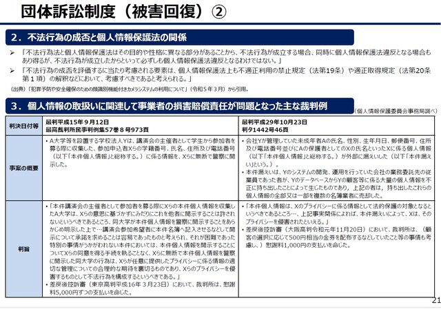 また本資料21頁は、個人情報の取扱いにおいて損害賠償責任が問題となった主な事例として、早大名簿提出事件(最高裁平成15年9月12日判決)とベネッセ個人情報漏洩事件(最高裁平成29年10月23日判決)をあげています。