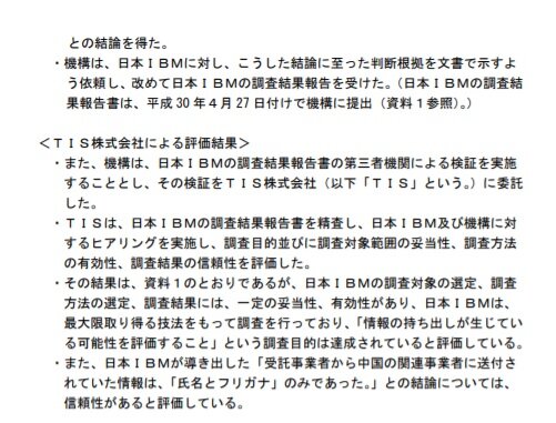 この点、2018年6月に公表された、第三者委員会調査報告書(「日本年金機構における業務委託のあり方等に関する調査委員会報告書」委員長:安田隆二・一橋大学教授)を読み直すと、同報告書が認定した事実は、日本年金機構の委託先のSAY企画から中国企業に無断で再委託がなされ、「氏名・ふりがな」データが送付されたとする日本IBMの調査結果の報告書を、そのIBMの報告書を再検査したTIS社が、「IBMの検査は妥当」と判断したということだけです。