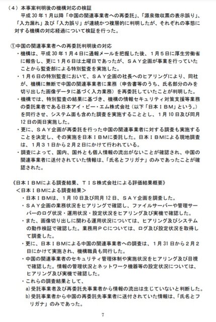 つまり、独立行政法人等個人情報保護法7条1項違反(安全確保措置)で中国企業に再委託がなされ、個人情報が中国企業に渡ってしまったということが、外部の調査を行った企業などが認定した事実です。「マイナンバーや個人情報が日本年金機構から流出してない」などということは、IBMもTISも第三者委員会も認定していないのです。この点、水原理事長の発言は間違っています。