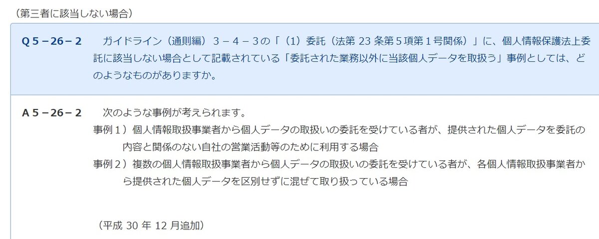 すなわち、個人データの委託というより、CCCの主導による他社の個人データの突合による個人データの利用のようです。したがって、これはそもそも個人情報保護法23条5項1号の委託のスキームを踏み越えているので、CCCは、原則に戻って、B社から本人同意に基づく第三者提供(法23条1項)によって個人データBを受け取っていない限り、この取り扱いは許されないことになると思われます。